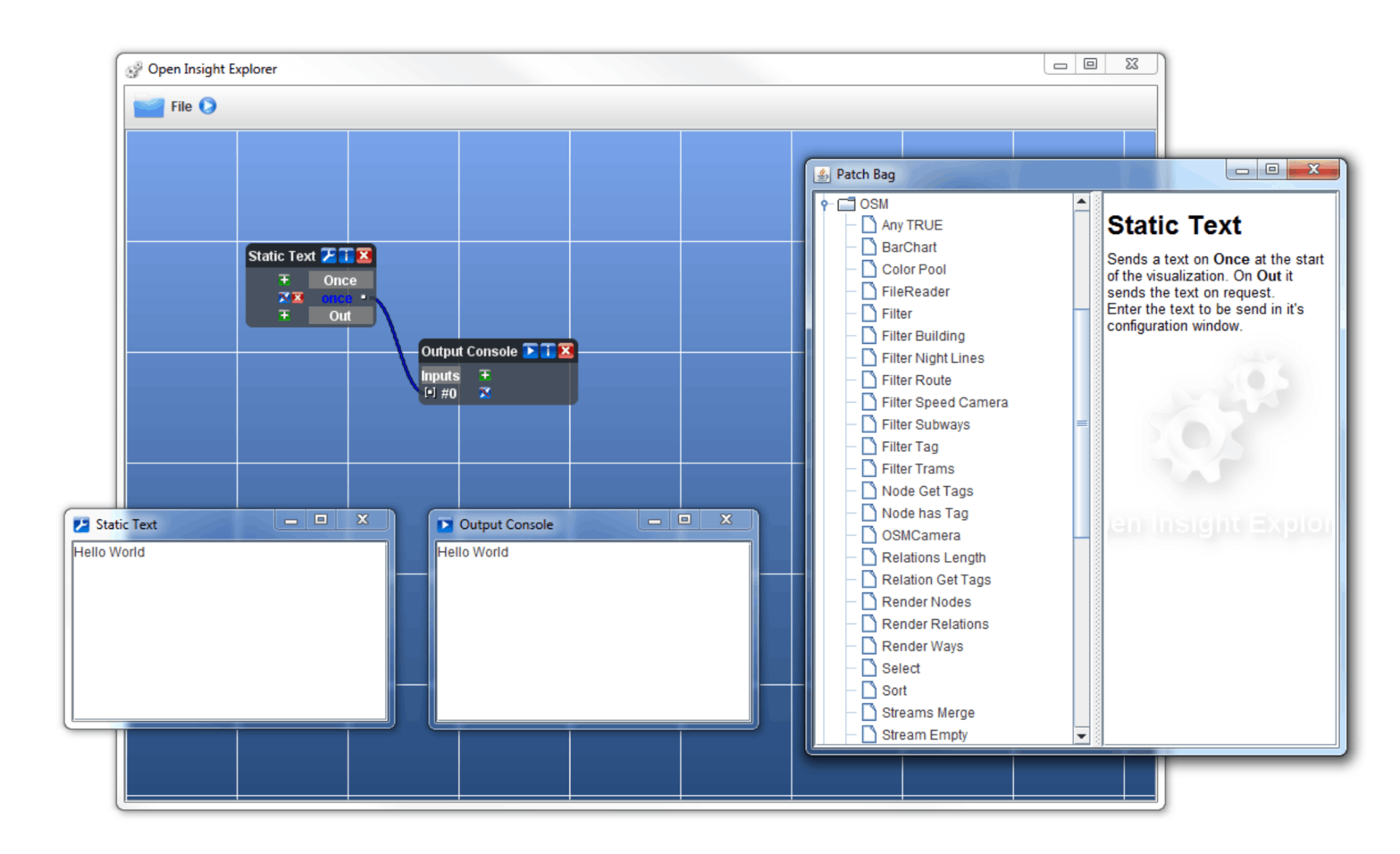 The goal of this thesis is to develop a dataflow visual programming language (DFVPL) and a visual editor for the rapid development of visualizations. With this programming language, called OpenInsightExplorer, users can develop visualizations by connecting graphical representations of modules rather than writing source code. Each module represents a part of a visualization program. Modules are designed to function as an independent black box and they start to operate as soon as data is sent to them. This black box design and execution model allows to reuse modules more frequently and simplifies their development.
